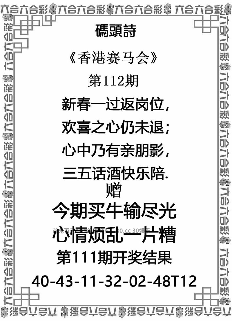 112期:新春一过返岗位,欢喜之心仍未退,心中乃有亲朋影,三五话酒快乐陪。 特肖:龙兔虎牛鸡狗 | |||||||||||||||||||||||||||||||